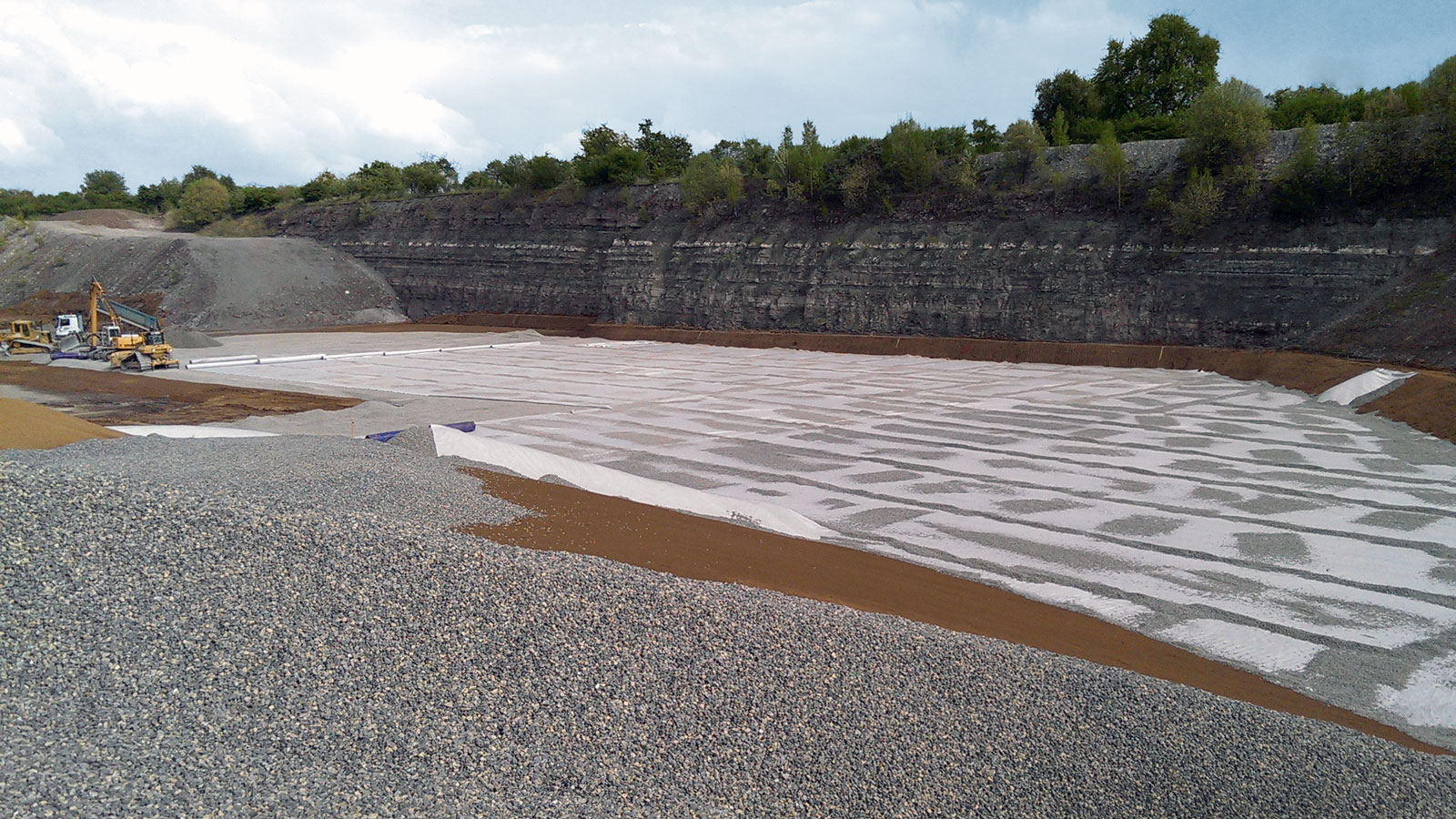 Deponiesohle mit eingebauter Kiesschicht, Tonversiegelung und Geotextil.